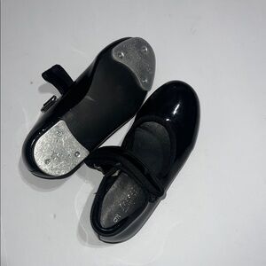 Stylish black tap shoes for kids. Shiny finish with secure velcro strap.