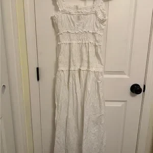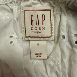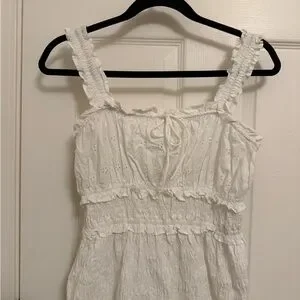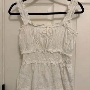 This elegant white eyelet top features charming ruffle details, perfect for a chic and feminine look. Ideal for any occasion, it offers both style and comfort.