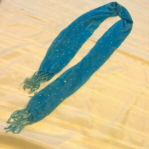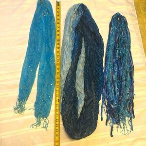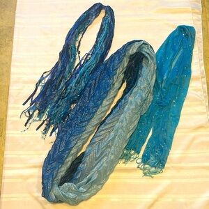 Pre-loved. Well taken care of. The turquoise with stick-on sparkles is light weight & perfect for that extra “umph” to your outfit. The handmade ALL RIBBON scarf has every tone of blue, knotted at the neck and each ribbon flows freely. The large donut scarf is textured material…starts with light blue & weaves its way color-wise to midnight blue—all w/subtle sparkles. This one can be doubled around your neck!! Upgrade any outfit for office to jeans. Bundle of THREE.
