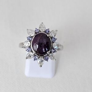This natural star ruby and multiple gemstone floral ring, exquisitely crafted in sterling silver, features a star ruby surrounded by a delicate floral arrangement of moissanites and tanzanites. The vibrant hues of the gemstones beautifully complement the deep mesmerizing hue of the star ruby, enhancing it's natural luminescence. Stamped by designer and 925. Size 7.
