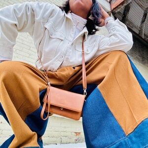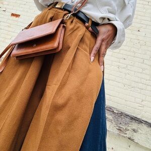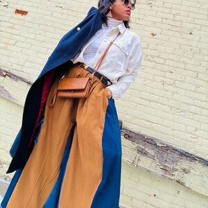 Vintage upcycled wool blend trousers with hour blue denim patchwork accents. Comes equipped with belt loops and cargo style pockets. Fits a 31” waist, 32” inseam.