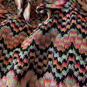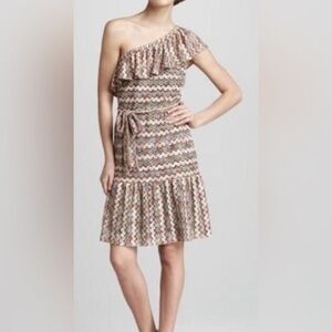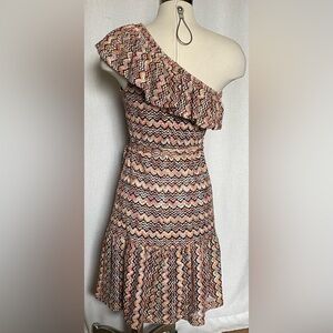Colorful and fun pattern. One shoulder. Self tie sash at waist. Ruffle at bottom. Dress is lined. Comfort and style!