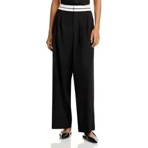 The WAYF Preston Wide Leg Pants in Women's XS are black dress pants with a front zip closure featuring a hook and bar. Made from a blended fabric of polyester, spandex, and rayon, these pants have a high rise and a 31-inch inseam. The wide-leg style and contrast-stripe waistband add a touch of sophistication to these versatile pants suitable for casual or business occasions during the summer, fall, and spring seasons. Machine washable and featuring a flat front, these pants by Wayf offer a classic and stylish look for any wardrobe.
