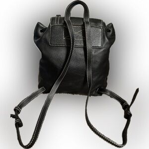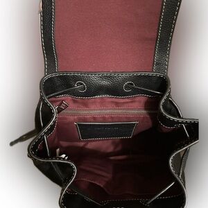 Elegant black leather backpack by Marc Jacobs. Features silver accents and secure lock detail.