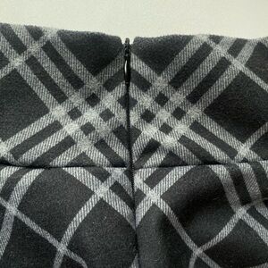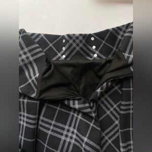 Thick weight material so more structure than your average skater skirt. Has built in stretchy black shorts. Gray and black plaid. Corset closure front design detail. Add your own ribbon. Missing Ribbon. Invisible zipper on back.