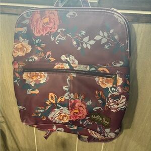 Chic Matilda Jane backpack and wallet with floral design. Plum base with pink and orange flowers. Perfect for everyday style.