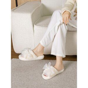 Women's White Cute Bow Open Toe Fuzzy House Memory Foam Anti Skid Slippers Shoes