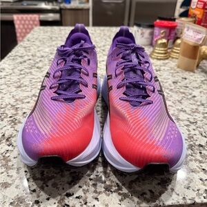 One of the bounciest ASICS trainers that's functional for various speeds and distances. Used twice for a total of 18 miles. Color- Edo Purple/Black.