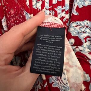 Pretty floral blouse by Tommy Hilfiger with intricate red and white patterns. Has beautiful red embroidery. Short sleeves and keyhole neckline. Perfect for casual outings.