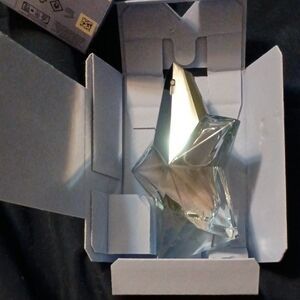 Mugler Angel Eau de Toilette. Features iconic star design. 50ml refillable bottle. I got it as a gift and it's just not for me. As you can see though, it's basically new and full. Box does have a little crinkle on the top front corner and the point of the star put an indent on the top.