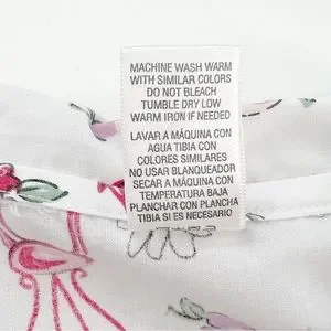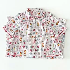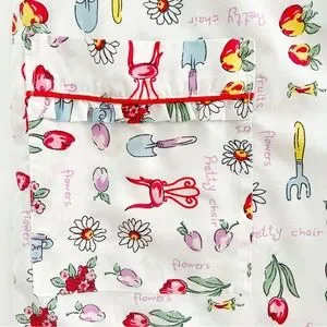 features the sweetest medley of garden daydreams with pretty chairs, fruits, flowers & more. The peter pan collar & pockets are adorned with ruffle trim finished with red piping and pearl snap front closure. White with multicolor print.