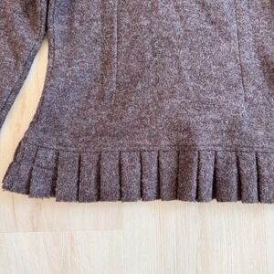 Keywords: Marisa Christina sweater, wool cardigan, boiled wool knit, ruffle trim sweater, womens sweater, brown cardigan, size small, dressy sweater, classic cardigan, retro sweater, vintage inspired, knitwear, wool jacket, casual sweater
