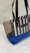 This signature piece features a transparent upper with the iconic black/white striped inner bag and a striking patent electric blue base. The dual black patent leather-look handles add a touch of polish. This bag is a chic and functional collector's item from a beloved, retired brand.