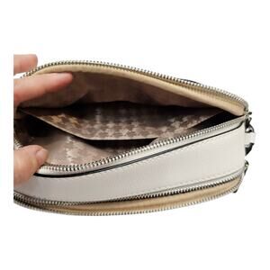 This Karl Lagerfeld Maybelle camera bag is a stylish and functional accessory for women. It features a crossbody strap handle style with a 23" drop, making it easy to carry around. The bag is made of durable faux leather and has a solid pattern with a zip closure. The exterior is white in color and has a small size with dimensions of 9" x 6" x 3".