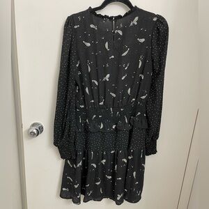This dress has a cool and unique print of stars and shooting stars on most of the garment, while portions are polka dots. Black body with white pattern; Zoom in and you will also see the pale green in the shooting stars. Please see photos for materials and care. Happy to answer additional questions or entertain offers!!