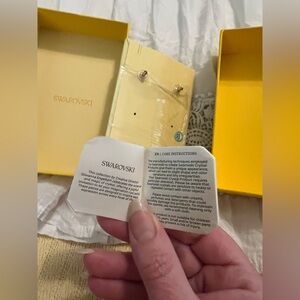 Elegant Swarovski signum swan crystal dangle earrings with rose gold finish and white crystal accents. Perfect for any occasion.