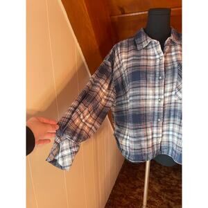 This Scotch & Soda women's cropped plaid flannel shirt is in excellent used condition! The pink and blue color combination makes it a fun and versatile piece for any wardrobe.