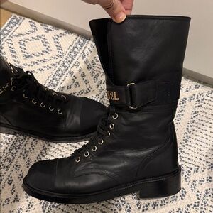 Elegant black boots with gold detailing. Features lace-up front and branded strap. Only signs of wear are on soles and minor creasing from shipping. Just bought these from another posher - I have very big calfs and they were a little snug on my leg not my foot. Paid 1500 for them, discount being offered without wearing them. I love them and wish i could keep them, my loss is your gain! US 10, true to size.