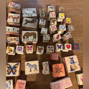 Explore creativity with this wooden stamp set featuring alphabet, animal designs, and more. Perfect for kids to learn and play. Most have been used, but still lots of life left in them! You get everything pictured.