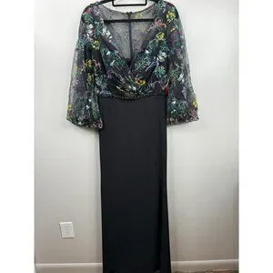 Mac Duggal Puffed Sleeve Maxi Dress Gown Illusion Embroidered