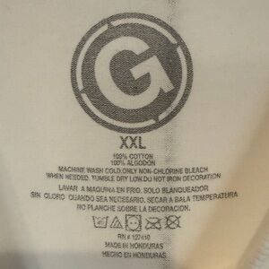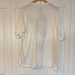 White t-shirt featuring a black graphic print of a musician with a double-neck guitar.