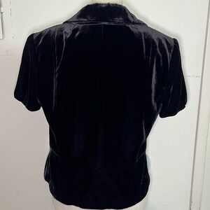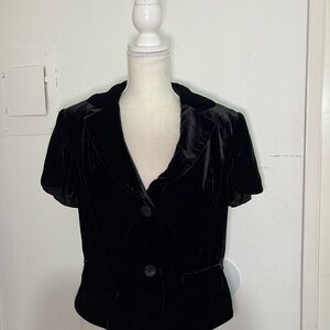 Chic black velvet blazer with short sleeves. Features button closure and front pockets. Ideal for stylish occasions. This is a gorgeous top made of luxuriously soft non-stretch.