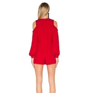 Embrace the festive feel of the Asher Romper by Alexis. Vivid in cherry red and embellished with velvet-covered buttons lining the cold shoulder cut-outs, this piece epitomizes party-ready luxury. Self: 99% viscose 1% elastane.Lining: 100% poly. Dry clean only. Shoulder cut-outs. Velvet covered button accents. Buttoned cuff sleeves. Hidden back zipper closure. Body measures approx 29.5" in length. Leg opening measures approx 30". Revolve Style No. AXIS-WR123. Manufacturer Style No. ASHER. Good preloved condition. Size medium