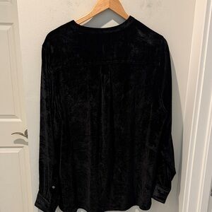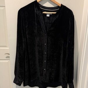 Chic black button down shirt. Features long sleeves and elegant buttons. Perfect for versatile styling.