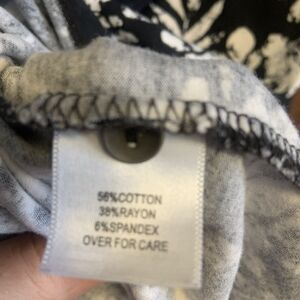 This Women's Relativity white and black floral and leaf stretch top in size S is a stylish and versatile piece perfect for various occasions such as travel, casual wear, or workwear. The top features a V-neckline, 3/4 sleeves, and a pullover closure for easy wear. Made from a blended fabric of 56% cotton, 38% rayon, and 6% spandex, this top offers a relaxed fit with stretch for added comfort. The floral and leaf theme adds a touch of charm to the basic style, making it a great addition to your wardrobe for the winter, fall, or spring seasons.