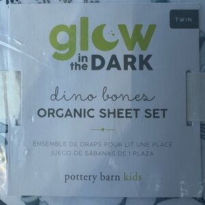 100% Cotton, Organic Twin size sheet set with glow-in-the-dark dinosaur skeletons. Fun and educational design. 1 flat sheet, 1 fitted sheet and 1 pillowcase.