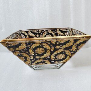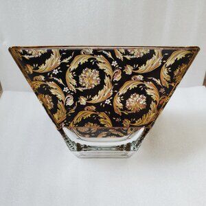 Stylish squared heavy glass bowl with unique paintings with golden accents and wide golden trim. It looks beautiful and rich in any design for your room. Pre-owned. Excellent condition. Top opening: 10 x 10 in. Bottom base: 4 x 4 in. Depth: 5 in.