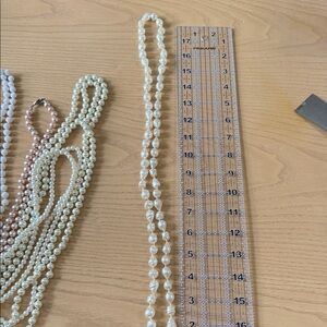 This elegant set of pearl necklaces features a stunning array of white and cream pearls. Perfect for adding a touch of sophistication to any outfit.