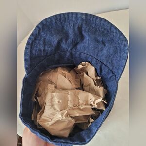 Handmade item. Dark Wash denim material in a train conductor style. Inside measures approximately 20 inches around the inside band. Excellent condition.