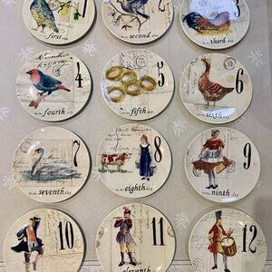 Discontinued gorgeous pattern.🍽️ Each of the 12 plates has the number of the days and corresponding lyric for the song. Great conversational piece. No chips and color still really great, but some minor crazing on the back of plates. Vintage look with gorgeous font and art!