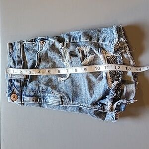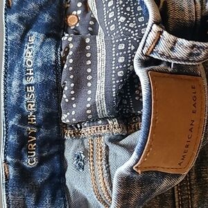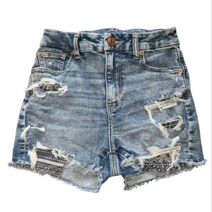 Great condition! Worn only a couple of times at best! Soft, stretchy and comfortable, high rise shorts, curvy fit. Medium blue, lightly distressed, intentionally exposed pockets with pattern details. *Bundle with other items from my closet for extra discounts!