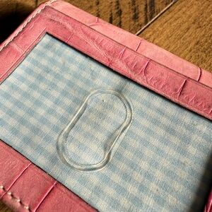Light pink crocodile style with blue white gingham check interior. Zip closure, snap. Card slot, lightweight. Think leather but no tag. Not in perfect condition, please look closely at photos - has some discoloration and staining especially in interior. Spots on leather as well. Good structural condition. Ask any questions, offers welcome.