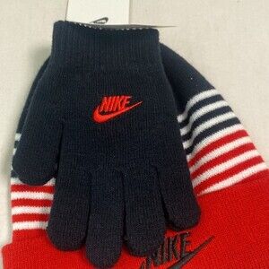Brand new winter knit boys striped black and red Nike boys beanie and gloves .. Black red knitted gloves. Two piece set.brand new winter snow ski outdoor . tags hipster hip hop athletic sports PE