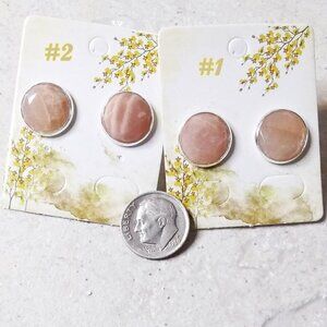 I have 2 pairs of these in the pale apricot/blush color available. The top of the cabochons are faceted for a bit more reflection and shimmer. Price is for 1 pair - choose your favorite in the drop-down menu. Pair #1 is a shade lighter in color hue than pair #2. Set into a bright silver tone bezel cup, and with silver plated bullet stops.