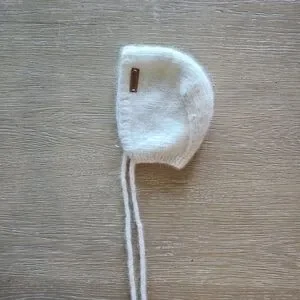 Soft and cozy white knitted baby bonnet, perfect for keeping your little one warm.