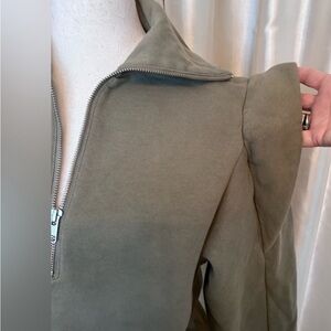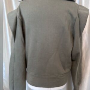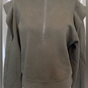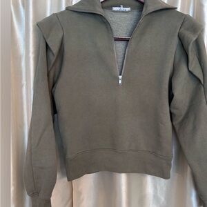FRAME Quarter Zip Ruffle Shoulder Pullover Sweatshirt in Military Green Small