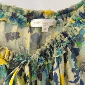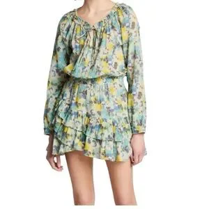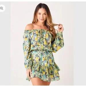 Charming mini dress with vibrant floral pattern. Features off-shoulder design and ruffled hem. Ideal for sunny days.