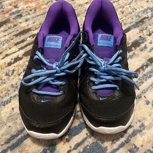 These shoes are used but in good condition they are Nike brand they do not come with the box. They are blue, purple, and black. I would say they are not really good for wide feet so I use them ones for the gym