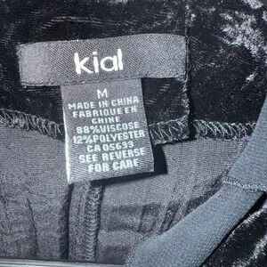This is a pre-owned Kial women's black velvet blazer, size M. It features a ruffled lapel and a peplum hem. The blazer has long sleeves and two front flap pockets with button closures. The material tag indicates 88% viscose and 12% polyester. Visible imperfections include small holes on the inner lining near the armpit and some minor wear on the velvet fabric, particularly around the pockets, as indicated by the pen in the close-up images.