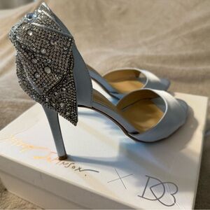 Chic light blue heels by Betsey Johnson. Features a dazzling rhinestone bow. Ideal for adding elegance.
