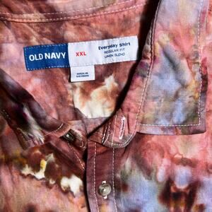One-of-a-kind Old Navy button down, hand-dyed using the ice dye method. Unique palette with blue, brown, purple, red.