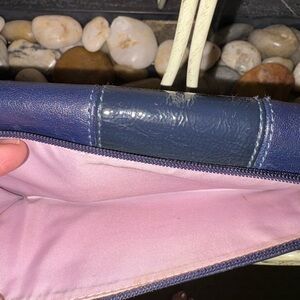 This vintage Coach tri-fold navy blue wallet is perfect everyday use wallet. Its sleek design and rich color make it a must-have accessory for any Coach purse! One small callout on the inside, looks like a pen mark or scratch.