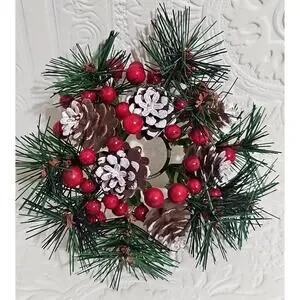 Charming faux Christmas candle ring wreath featuring realistic evergreen sprigs, red berry accents, and frosted pinecones. Designed to sit perfectly around a taper or pillar candle, this piece adds a classic holiday touch to a mantel, table centerpiece, or shelf display.