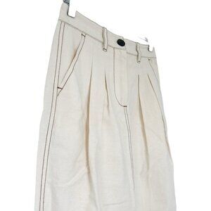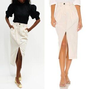 NWOT Florence skirt by Mara Hoffman. Natural white color. Pencil silhouette in natural structural woven cotton. Denim-like material. Midi length pleat front with brown contrast stitching, center slit and side pockets. High waist with belt loops. Zipper and button closure at front. Made from a combination or regular and recycled cotton. Unlined. Brand new without tags from the now-shuttered brand!