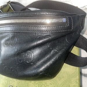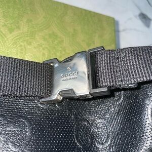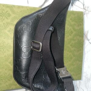 Stylish black calf leather belt bag with embossed Gucci GG monogram logo. Ideal for modern fashion.