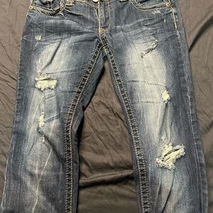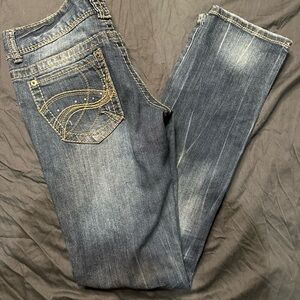Trendy faded indigo skinny jeans. Features stylish pocket embroidery. Perfect for casual outings.